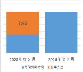お知らせ 2024年問題への取り組み「月間」 2026-03-13 11:32:51 取り組みの1つとして、労働時間の短縮に努めています。 <月間前年比較> ◆2025年度2月と2026年度2月でおよそ増。 繁忙期の為、前年度よりも7時間増となりました。 引き続き月間で集計し更新していきます。
